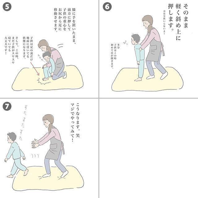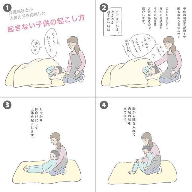 長男が小さい頃から使っているので10年以上わが家で使っている技です。高学年以上になると体が大きすぎてむずかしいので、今は主に小学2年生の三男を起こすときに使っています。本人はいつも『気付いたら歩いてる』って言います(笑)。とてもスムーズに起こせるのでおすすめです」