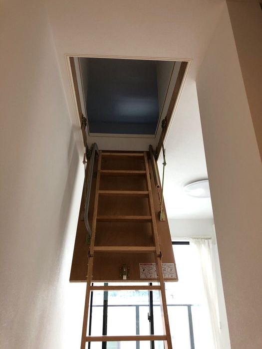 2階に上がる階段下のスペースは、外から物が取り出せる外部物置にしました。折りたたみ収納式のはしごを取り付けて屋根裏収納も確保しました。また、カウンターキッチン下は、子どもたちのおもちゃ収納スペースとして大活躍しています。