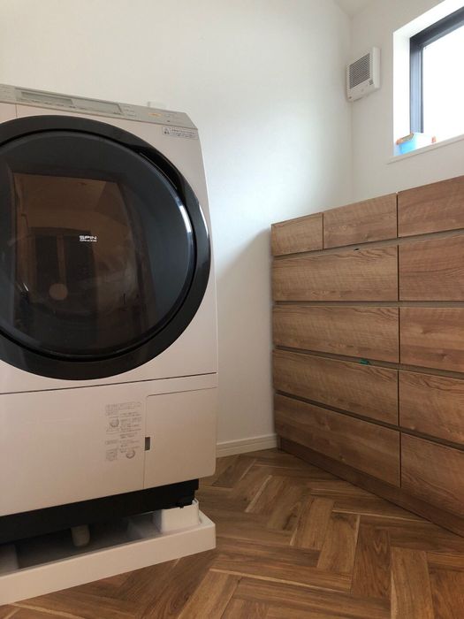 「家事や育児がスムーズにできるように家の中の動線を考えた結果、浴室、洗面脱衣所、ランドリールームは2階の1カ所に集約することにしました。子どもたちは洗面脱衣所で服を脱いだら、自分で洗濯機へ入れることができます。洗濯機を回したら、その場で室内干し、乾いたらそのまま収納と、ワンストップ化が実現できたんです。
