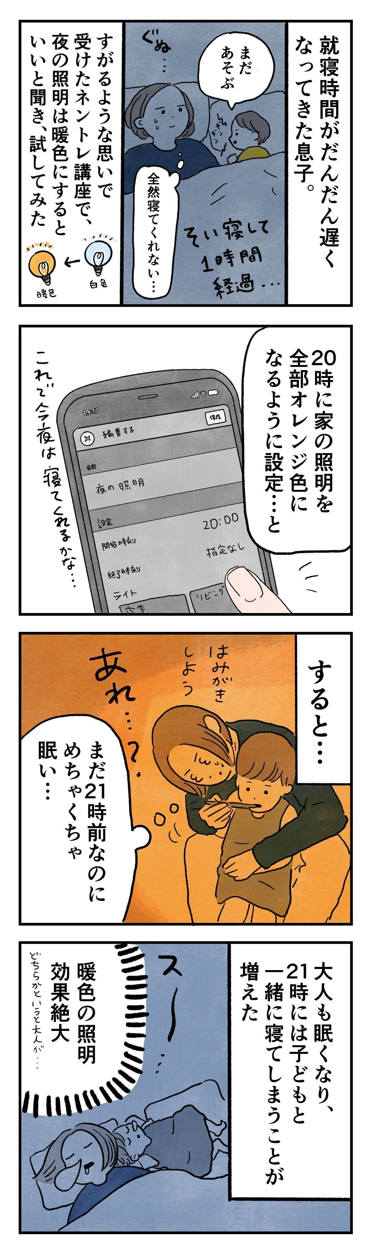 夜は照明を暖色にして、テレビやスマホの光ができるだけ目に入らないようにするといいそうです。いつもテレビや照明を煌々(こうこう)とつけていたせいか、親にも効果てきめんでした。