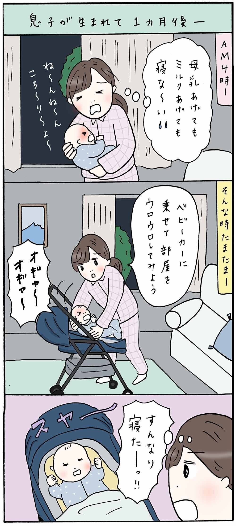 「ベビーカーで動かすとすぐ寝る!」と気づいてからは、寝かせたい時は、家の中をベビーカーでずっとウロウロしておりました。ちょっとした段差などがあると、よりよく眠りにつくので、何回も段差のあるところを通ったりしていました。