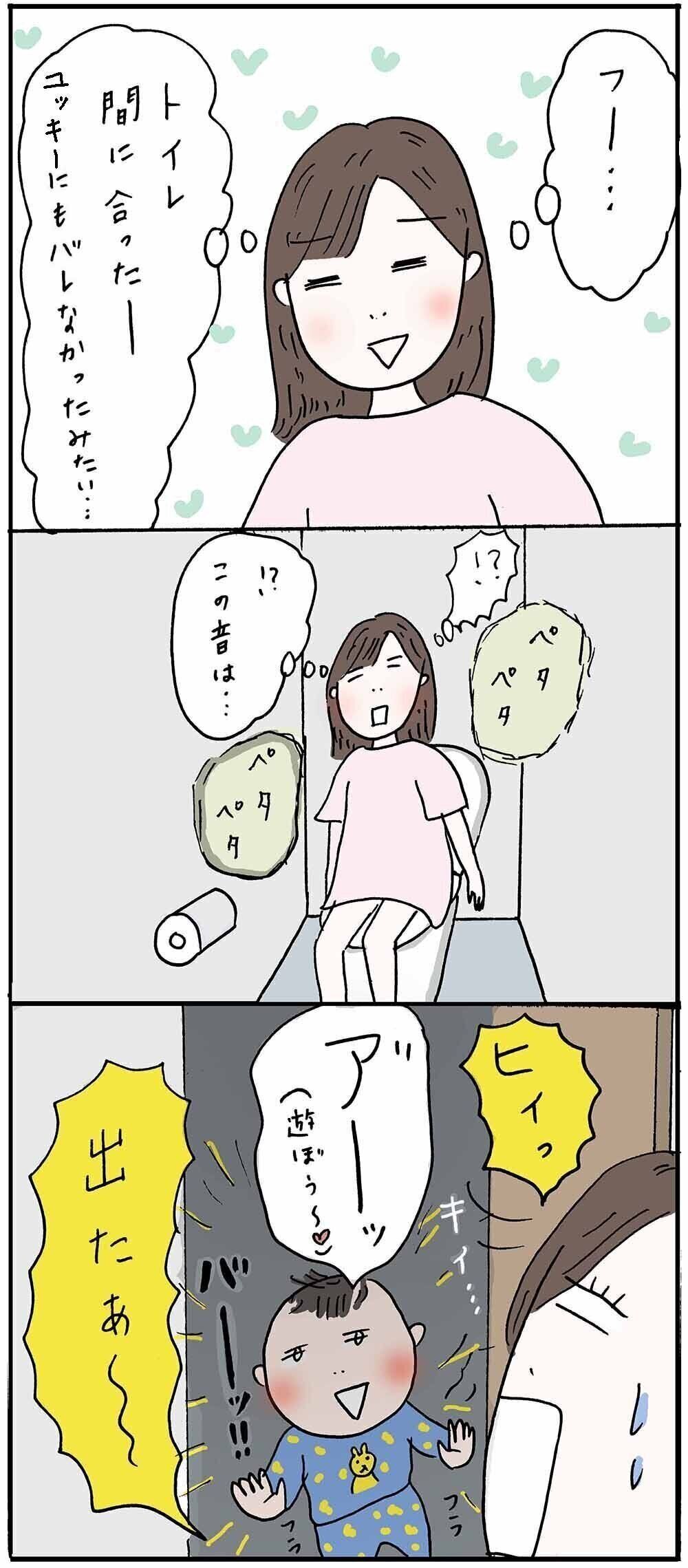 細心の注意を払って、そ〜っと部屋を出たのですが、ダメでした。息子は聞き耳を立てて、私が出ていく気配を察して、追いかけてきたようです。