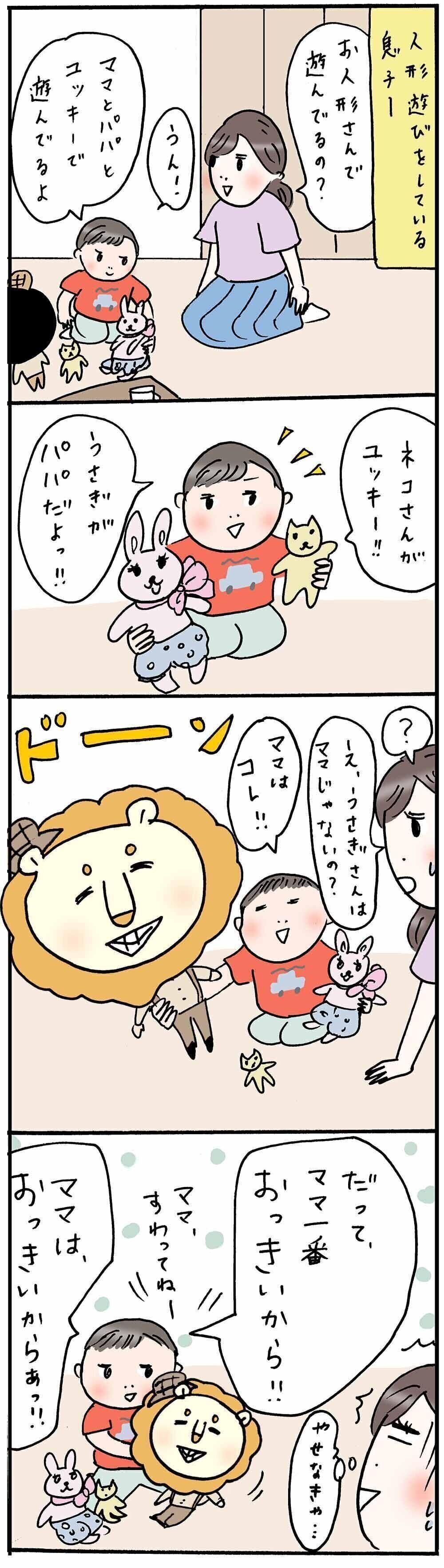 産後10キロ以上太ってしまい、身長も夫と同じくらいなので、息子から見ると家族の中で一番大きいのはママなのかもしれないな、と思いました。