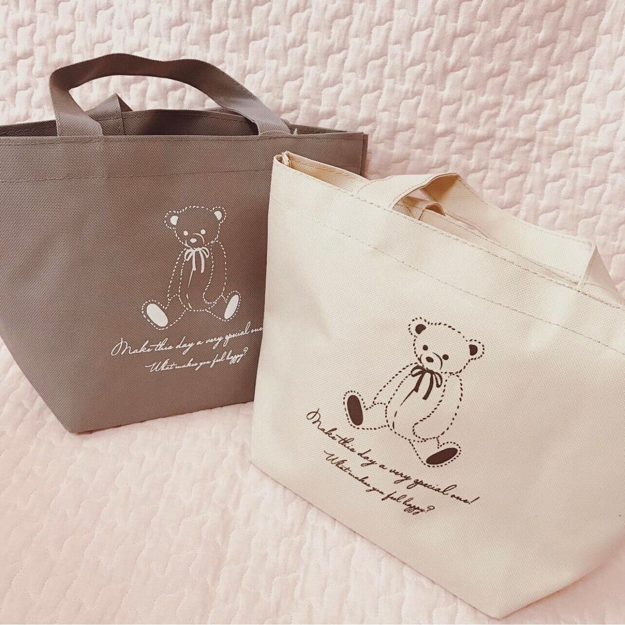 yusakoさんはキャンドゥでミニトートバッグを購入したそうですよ。アイボリー生地にはブラウンで、ブラウン生地にはアイボリーでくまさんがプリントされているみたいです。お弁当箱を入れてランチバッグにも、ちょっとしたお出掛けなどにも、マルチで使えるバッグですね。