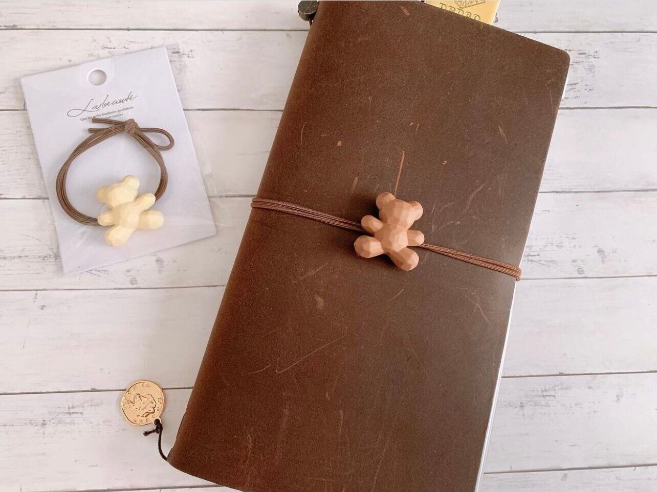 shiromaruさんはキャンドゥで購入したくまさんのヘアゴムをトラベラーズノートに装着。木彫り感のあるボコボコとしたフォルムが素敵で、こちらのノートの色味ともマッチしていますね。ゴムを付け替えれば、もう少し厚みや大きさのある本にも使えそう。