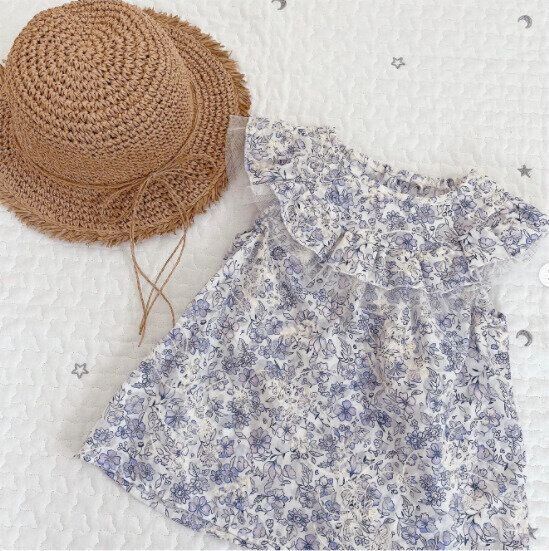 Yuさんは、インスタで見て気になっていたという麦わら帽子と花柄ブラウスを西松屋でゲットしたそう。濃い色の帽子と、爽やかなブルーのブラウスの組み合わせが抜群におしゃれですね!ブラウスの胸元にはレースもついていて、これ1枚でも上品なコーデになりそう。どちらも税込1,000円以下というプチプラアイテムです。