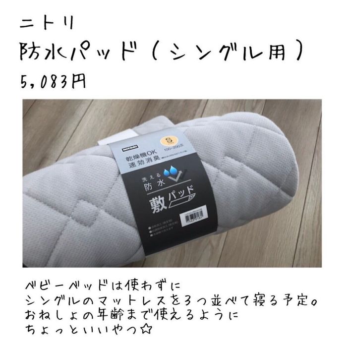 baby_kiroku_0407さんがお母様にプレゼントしてもらったのは、ニトリの防水敷きパッドです。速効消臭機能、乾燥機対応なので、お子さんのおねしょ問題もこれなら気を使いすぎることなく安眠できそうですね。