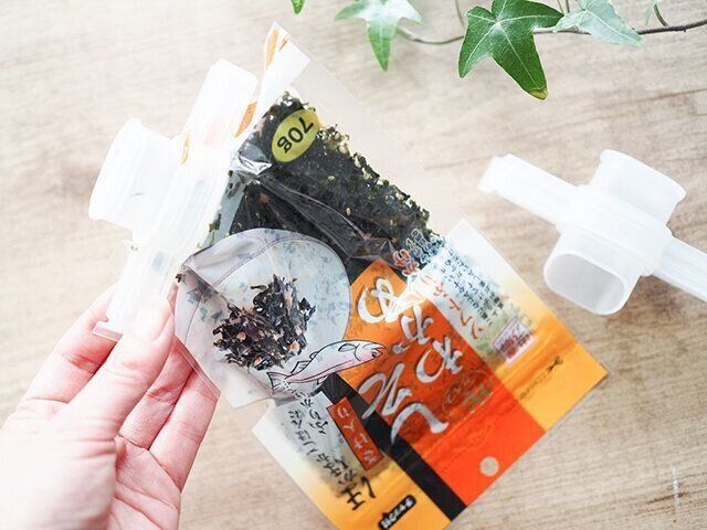 ほかにも意外な使い方を発見! ふりかけの袋の底側にキャップ付き袋用クリップを付けると、付属のチャックより早く開閉できてとっても快適! ふりかけの中身がばさっと大量に出てしまうのも防げますよ。