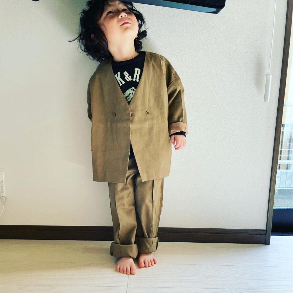 motoさんは、リジェールの3WAYリラックスノーカラージャケットセットアップを購入。幼稚園の入園式用にゲットしたんだとか。少し大きめだけど、普段着としても着られそうで購入してよかったとのこと。ゆるっとしたシルエットも素敵ですよね。