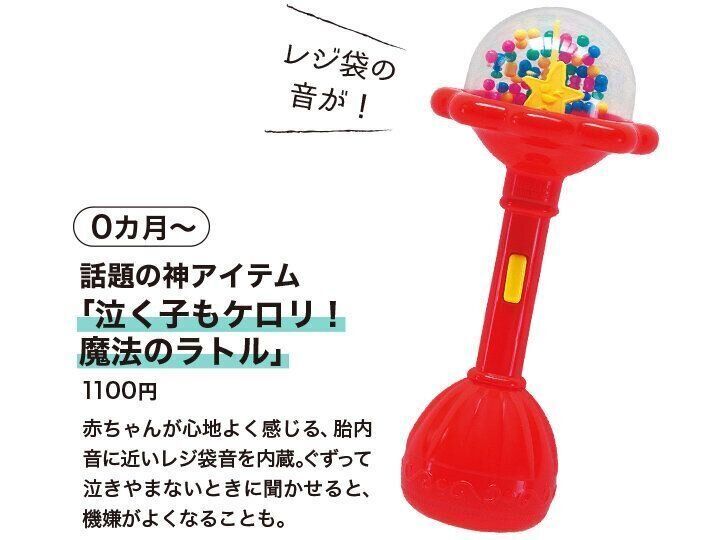 大翔くんに遊んでもらった「泣く子もケロリ! 魔法のラトル」も、“低月齢の赤ちゃんは、ママの胎内音に近いレジ袋の音を聞かせると落ち着いて泣きやむ“、という情報が寄せられて商品化しました。こちらも、”本当に泣きやむ!“との評判が口コミで広がっています。
