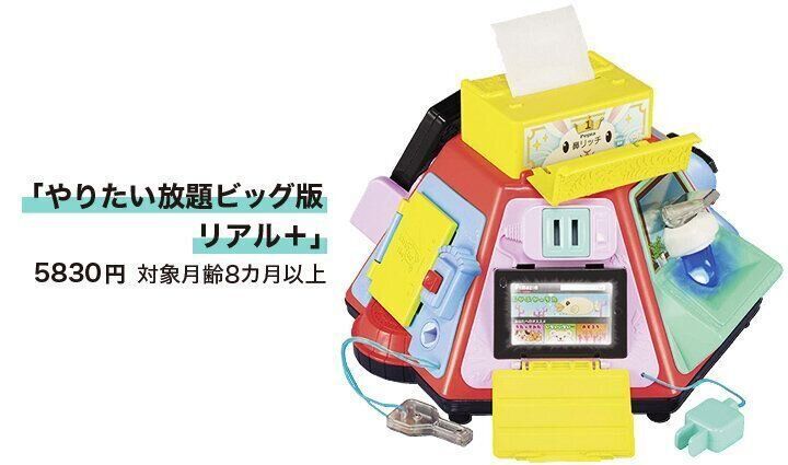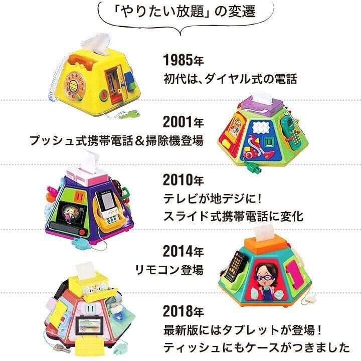 リモコンをポチポチしたり、ティッシュを引っ張り出したり。いたずらしているときの赤ちゃんはすごく集中していて、ダメと言いたいけれどやらせてあげたい気もする…。そんなママ・パパの思いを形にしたのが、「やりたい放題」。時代とともに、その時々の赤ちゃんが興味を持つアイテムをリアルに再現。現在5代目となっています。