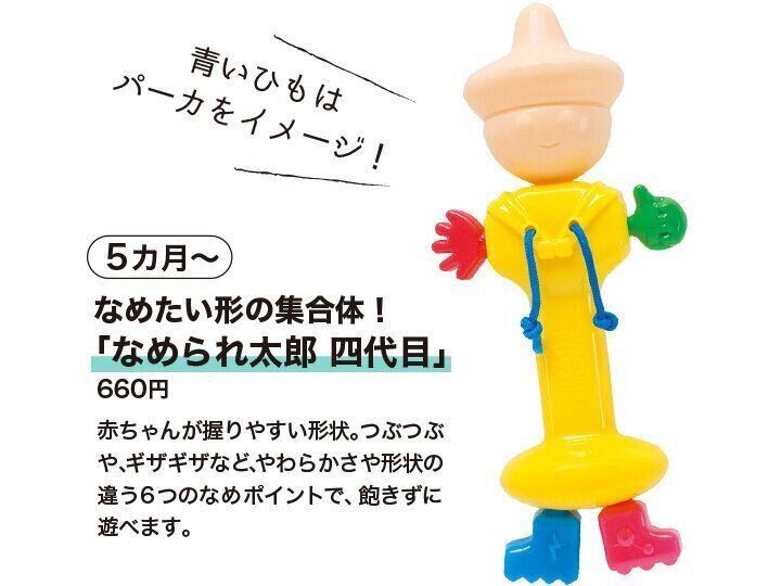 ”赤ちゃんが実際なめるものって、パーカのひもだったり、ボタンだったりするよね?“ というママ・パパの気づきを取り入れました。赤ちゃんがなめたがる形を集めているので”よく遊んでくれる!“と好評です。