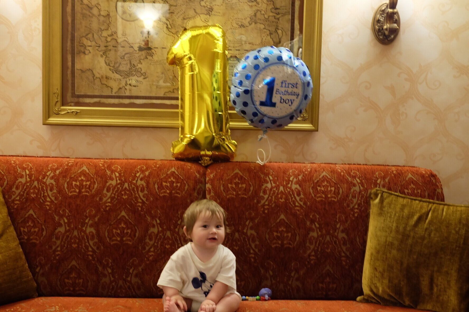 (写真は1歳の誕生日。1歳でおすわりができました)
