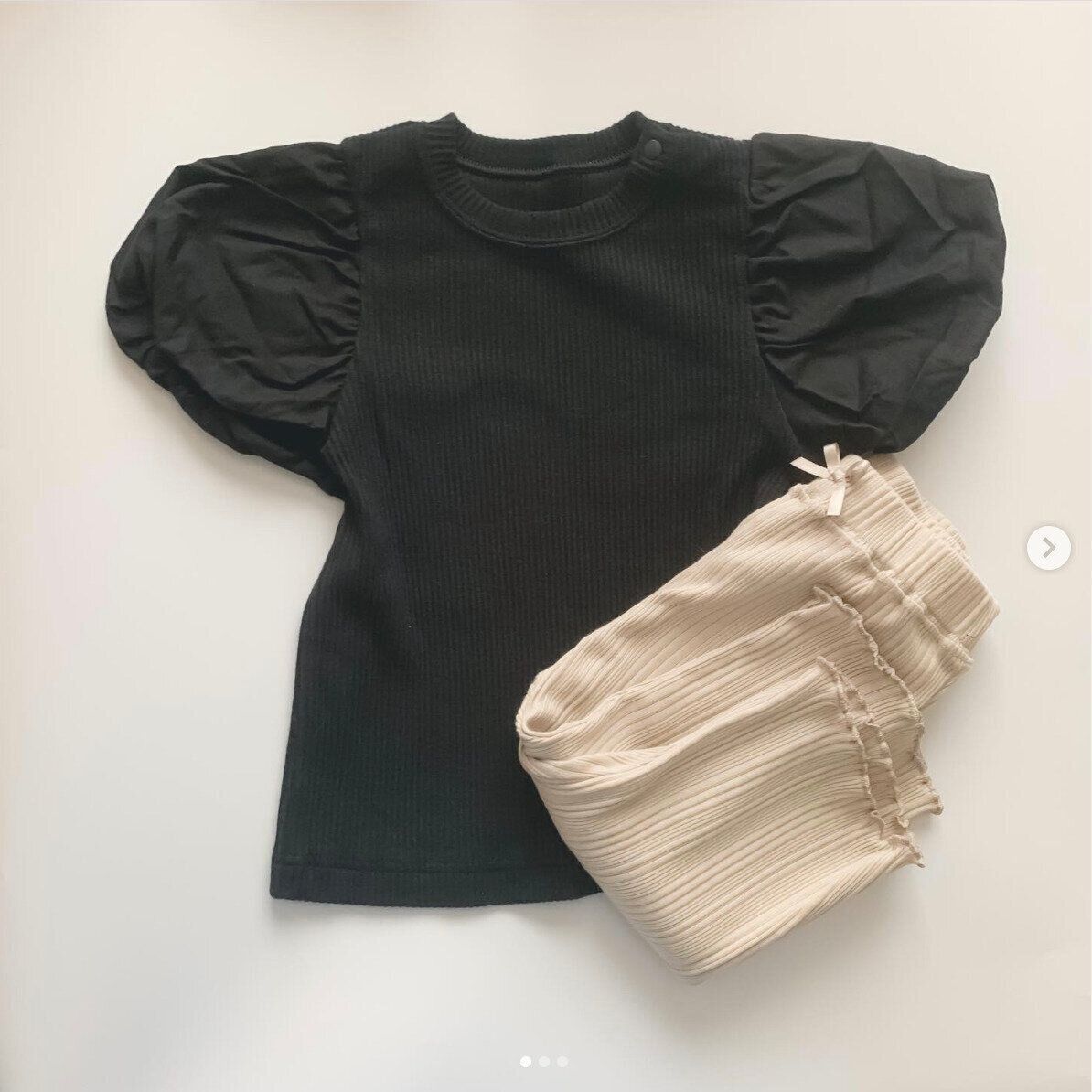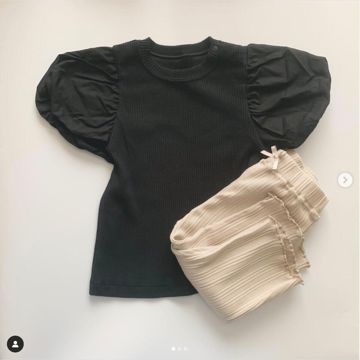 ごんさんはGU babyでこちらのトップスとリブパンツを購入したそうです。トップスは袖がパフスリーブになっていますが、色が黒で甘すぎないデザインになっているところがお気に入りなんだそう。普段使いにももちろん良いですが、キチンとしたコーデにも使えそうですよね。リブパンツとの相性も抜群です!
