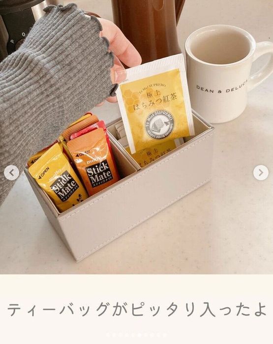 くすみカラーが可愛いこちらのアイテムは、セリアの「フェイクレザー仕切りケース」。yoiko.blogさんのようにティーバッグなどを収納すると、見た目もおしゃれですよね♪ カトラリーなどを収納しても素敵かも?