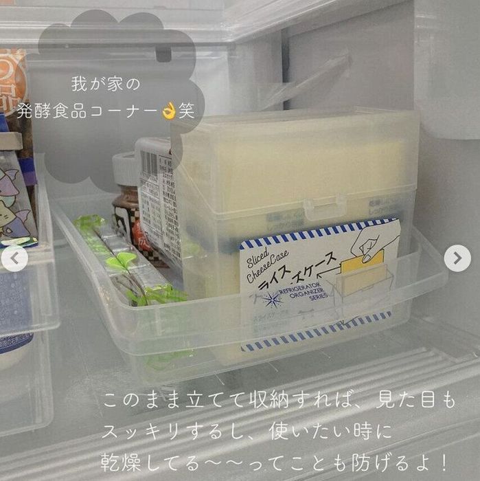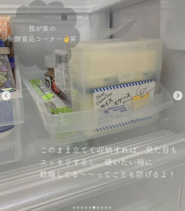 kumaman_kurashiさんがセリアで購入したのは、こちらの「スライスチーズケース」。外袋を開けるとバラつきがちなスライスチーズを、立てて収納しておくことができるそうです。シンプルなので、見た目もスッキリとしますね♪