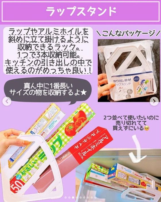 こちらはセリアの「ラップスタンド」です。3本のラップを、斜めに立てかけておくことができるとのこと♪ hasemen.mask_lifeさんは、キッチンの引き出しの中に収納しているそうです◎