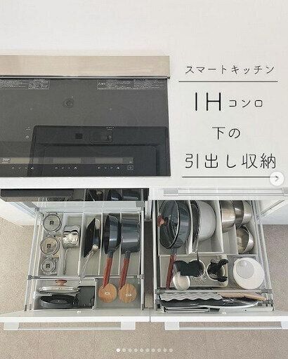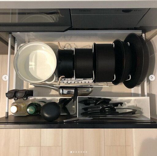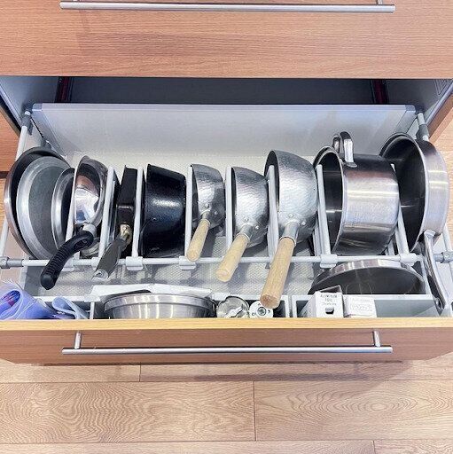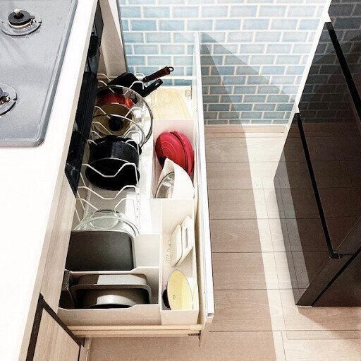 shimarisuさんは仕切りを使い、お鍋やフライパンなどを区切って収納しています。スッキリ収納することができ、気に入っているそうです。種類ごとにまとまっているので、簡単に取り出すことができそうですね。