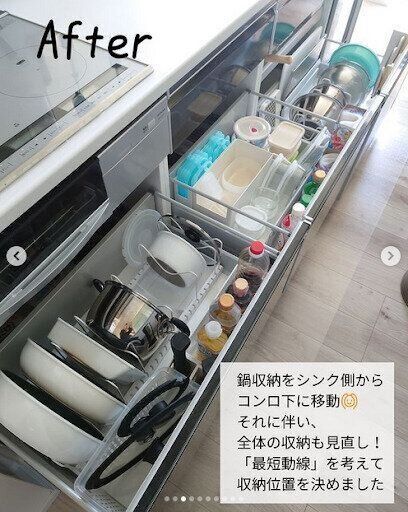 ayachiさんはお鍋の収納をシンク側からコンロ下へ移動。動線を考え、収納位置を決めたのだとか。使う場所と収納場所が最短距離になるように考えて決めたそう。確かに、使いやすそうですね!