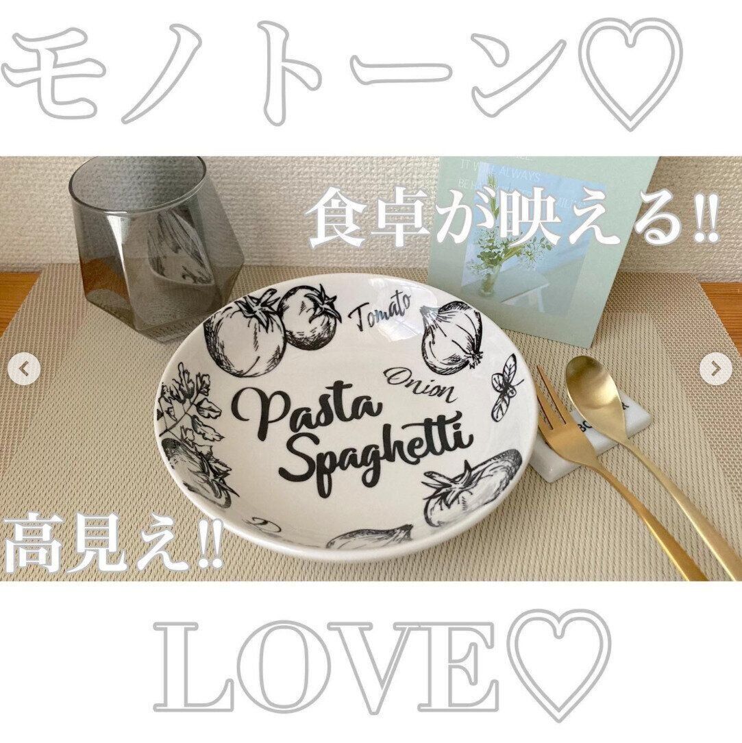 デザインがオシャレなこちらの食器は、maimaipapipuさんがセリアで購入したパスタ皿。モノトーンで大人っぽく、高見えしますよね♪ ある程度深さがあるので、スープパスタなどにも使えそう◎