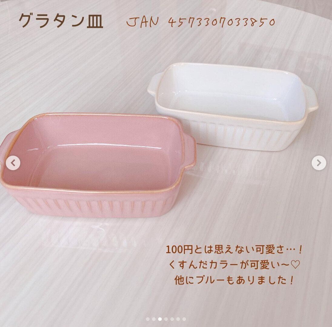 色鮮やかなこちらのアイテムは、セリアで販売されているグラタン皿です。rrriirooさんは、ホワイトとピンクの2色を購入したとのこと♪ オーブンや電子レンジ、食器洗い乾燥機にも対応しているようです◎
