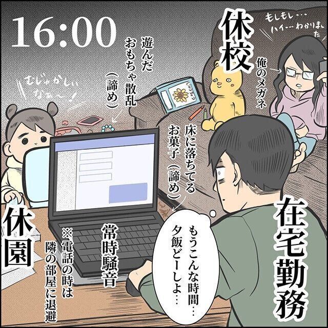 ゆーぱぱ「まず、会社には自宅の状況を伝えて、状況に応じて離席させてもらう形をとりました。食事など必要最低限のことをこなしつつ、あとは子どもたちの様子を見ながら仕事といった感じで、常にマルチタスクな状況でしたね。(子どもたちの時間の感覚が鈍らないようテレビ、YouTubeでオンライン幼稚園というものを流したりしました)