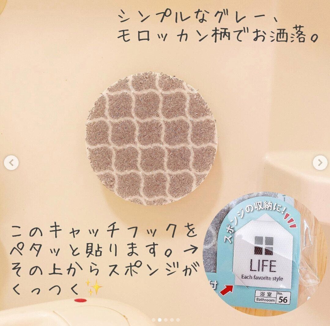 デザインがオシャレなこちらのアイテムは、ダイソーの「洗面台洗い スポンジ(フック付)」。蛇口の水アカなどを落とすことができるようです♪ 不要なときは、付属の「キャッチフック」に収納しておくことができるとのこと◎