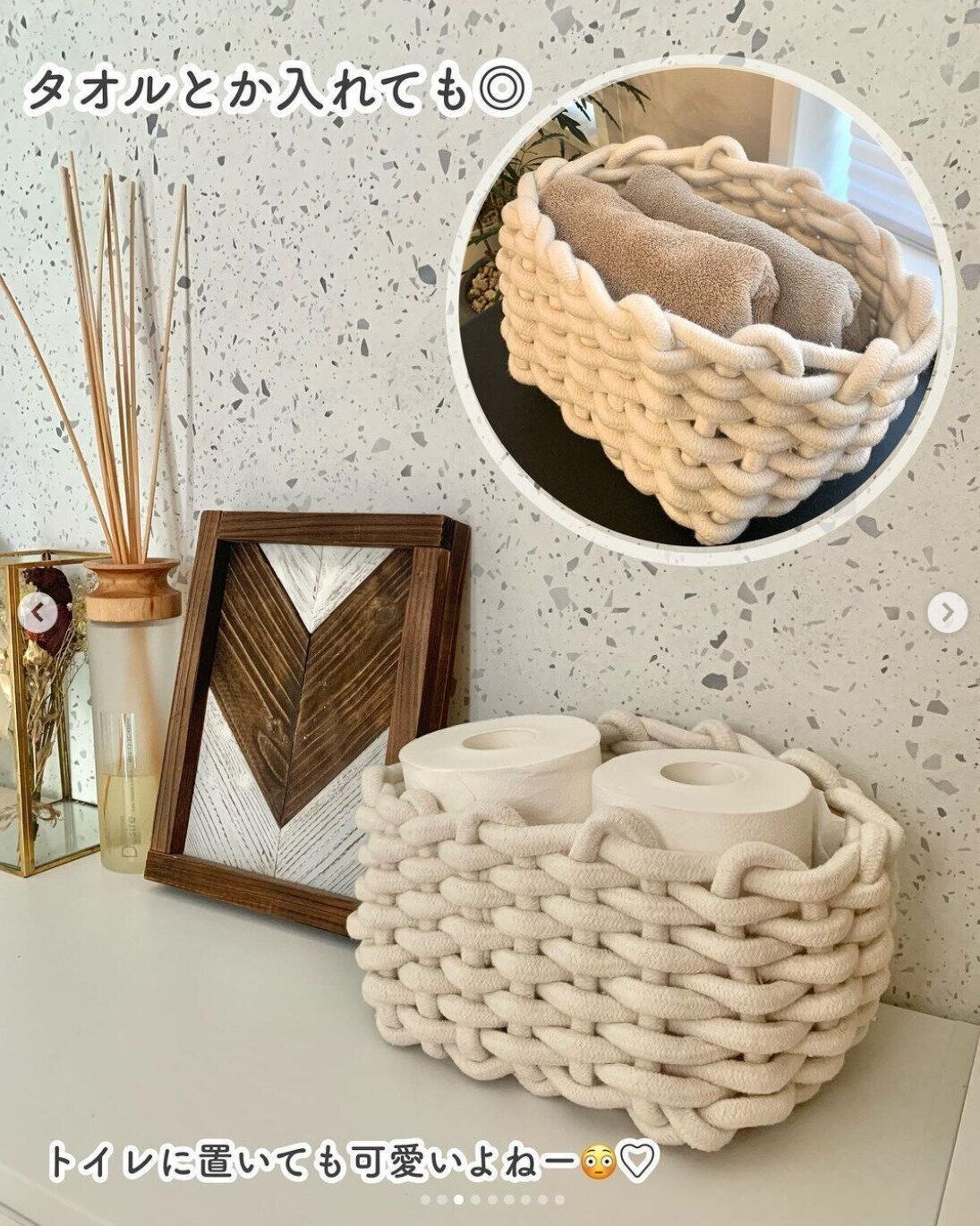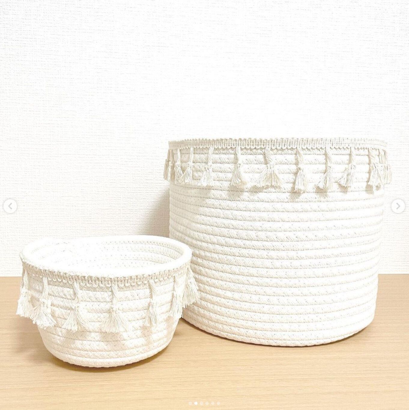 こちらは3COINSのフリンジバスケット。Sサイズは330円、Mサイズは1,100円のようです。mocha_life.12さんはアルコールスプレーやスリッパを収納する予定なんだとか♪ ごちゃつきがちな小物やおもちゃの収納にも使えそうですね。