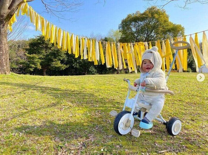幸子さんは、iimoTRICYCLE(イーモ トライシクル)の三輪車を購入。三輪車が大好きで、家でもずっと乗っていたんだそう。やっとお外で遊べる季節になったので、さっそくお弁当を持ってピクニックへとお出かけしたんだとか。色味も可愛らしい三輪車ですね!