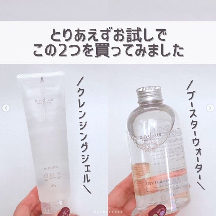 こちらは100yen_cosmeticさんが3COINSで購入したジェルクレンジングとブースターウォーター。日本製でSDGs対応成分を配合しているサステナブルなアイテムなんだそうです。デザインもシンプルでおしゃれですよね♪ どちらも550円商品とのこと。