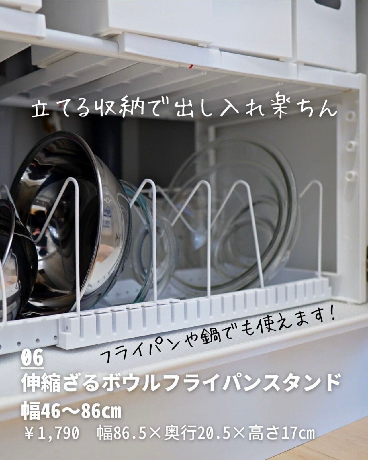 saku_lsjさんはニトリの「伸縮ざるボウルフライパンスタンド 幅46~86cm」を活用しているみたいですよ。重ねず立てて収納することで使いたいボウルをすぐに取り出せて、調理中の動作がスムーズになりそうですね。