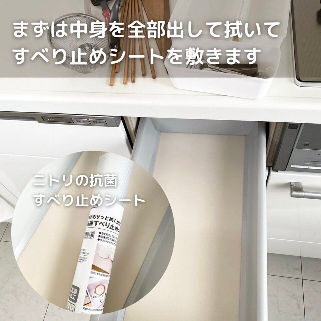 りえさんがニトリで購入したのは、抗菌すべり止めシートです。カップボードや収納棚など、収納前に敷いておくと、お掃除の手間も減り清潔に使えますよね。引き出しの開け閉めをしても、滑り止め効果で物が動きづらいのもうれしいポイント。