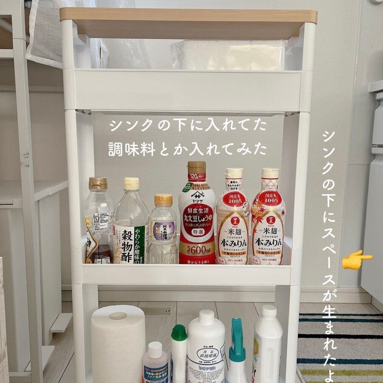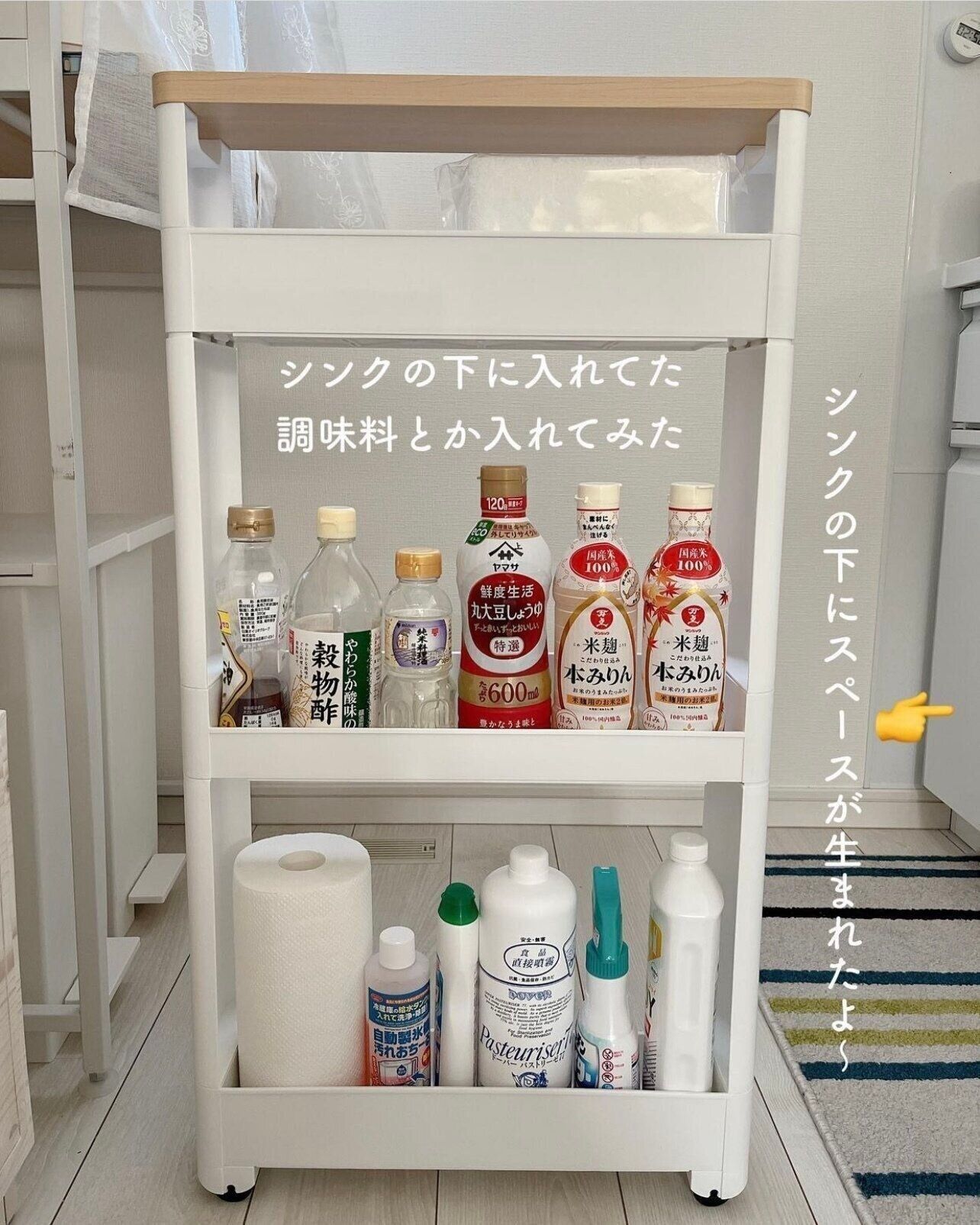 カップボード横や冷蔵庫横などのちょっとした隙間を埋めるのにぴったりなのが、ニトリのスマートワゴンです。デッドスペースを収納空間にしたことで、nico_home.ayiさん宅のキッチンにはシンク下に収納のゆとりが生まれたそうですよ。