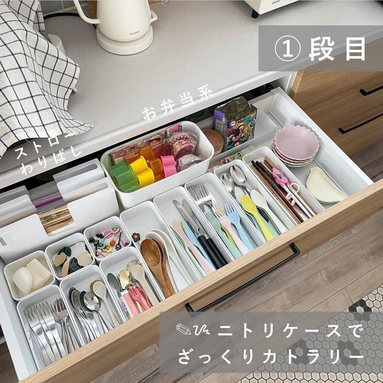 pori_no_ieさんはニトリのケースを使ってカトラリーを仕分けし、すっきり収納を実現しているようですよ。種類と大きさごとにざっくりと分けるだけでも取り出しやすく、しまいやすい収納が実現されていますね。