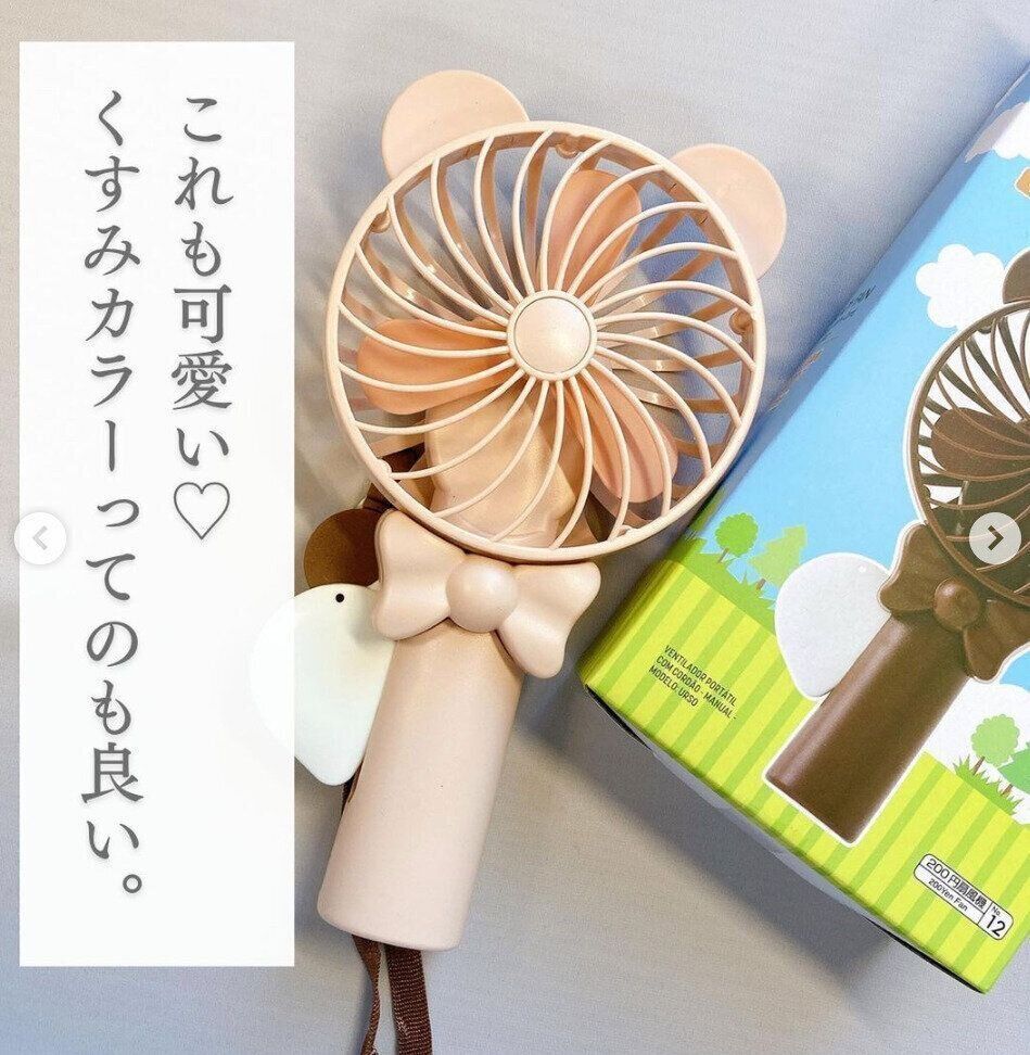 くすみカラーが可愛いこちらのアイテムは、ダイソーの「ハンディ扇風機(手動)」です。クマをモチーフにしており、首に掛けるストラップも付いているそう。いつでも手軽に涼むことができて便利ですね♪ こちらは220円で販売されているとのこと。