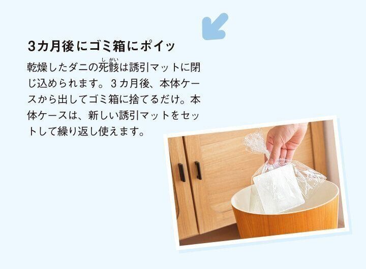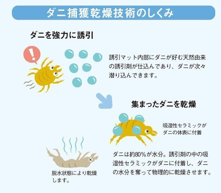 誘引マットに入ったダニを閉じ込め、ダニの水分を奪って物理的に乾燥する独自技術で退治します。誘引マットは化学性殺虫成分を使わず、天然由来成分を使用。安全性にこだわって作られています。