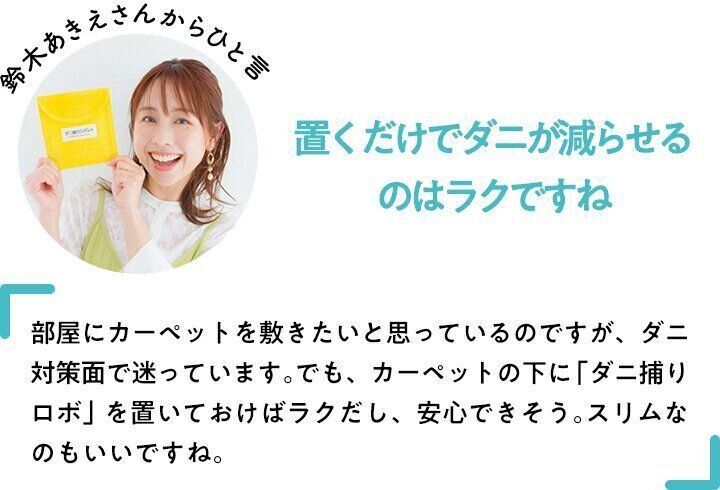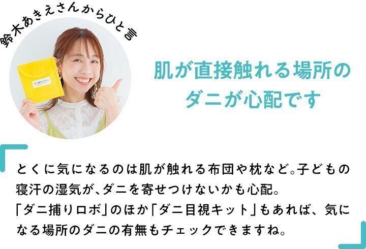 ダニが熱に弱いと聞いて、布団乾燥機をかけてから布団専用の掃除機をかけるようにしています。子どもが生まれてからは、ますますダニ対策が気になるように。でも、毎日いろいろなことに追われて忙しく、ダニ対策が負担になることも。だから、置いておくだけで生きたダニを捕獲できる『ダニ捕りロボ』は、大変なダニ対策を助けてくれる強力な味方というイメージです。」