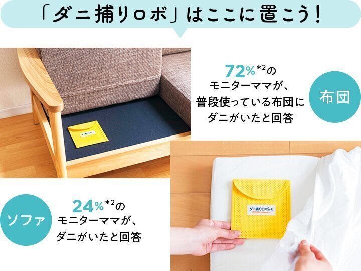 忙しいママ・パパでもカンタンにダニ対策ができる「ダニ捕りロボ」。布団やソファ、カーペットなどの下に約3カ月間、置いておくだけでダニを捕獲し、退治できます。