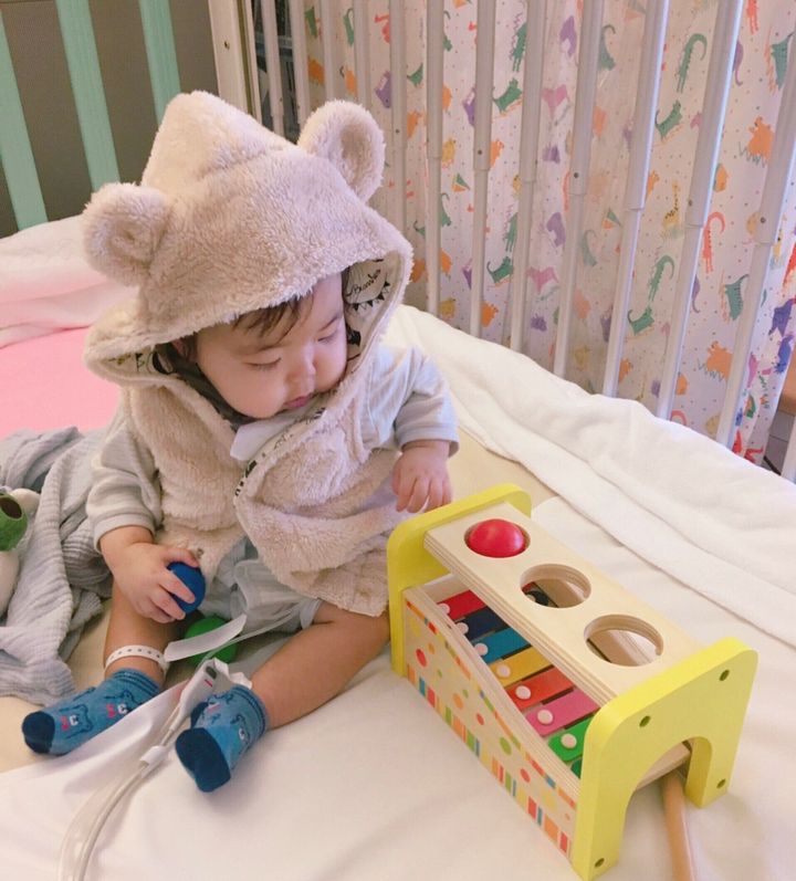 病室で迎えた1才の誕生日。笑顔が増えてきて、ようやく前向きな気持ちに