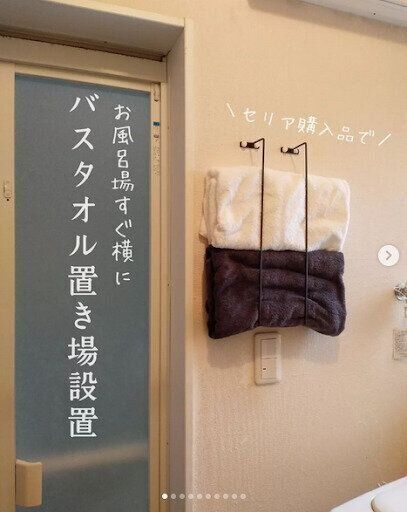 こけっこさんはセリアの購入品でお風呂場のすぐ横にバスタオル収納を作ったそう。セリアの留め具を使い、しっかりと設置できたようです。お風呂から出てすぐにバスタオルを取れるのは便利そうですね。