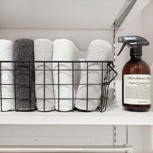 mayuさんはタオルをワイヤーバスケットに収納しています。数年前はタオルにもこだわりがなく色も数もさまざまだったようですが、色を統一させてワイヤーバスケットに入れるだけと決めてからはタオル収納がとても楽になったのだとか。見た目もとってもおしゃれですね。