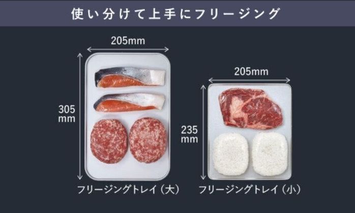 冷凍室の上段には、約-30℃の冷気で食材を一気に冷凍する「クイック冷凍コーナー」を搭載。熱伝導のよいフリージングトレー付きで、餃子(ギョーザ)やハンバーグなど下ごしらえをした食材や作り置きの料理を栄養やおいしさを逃さず素早く冷凍! 60℃のものまで入れられる※「クイック冷凍コーナー」は、熱々のごはんもラップしてそのまま冷凍できます。