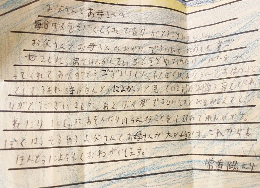 双子で大変だったという思いもありますし、もともと言葉にするのが苦手だった長男からの手紙であり、シャイな次男からの手紙ということで、色んな感情が思わず溢れだしちゃいました。双子っていいな!とあらためて思いましたね(笑)