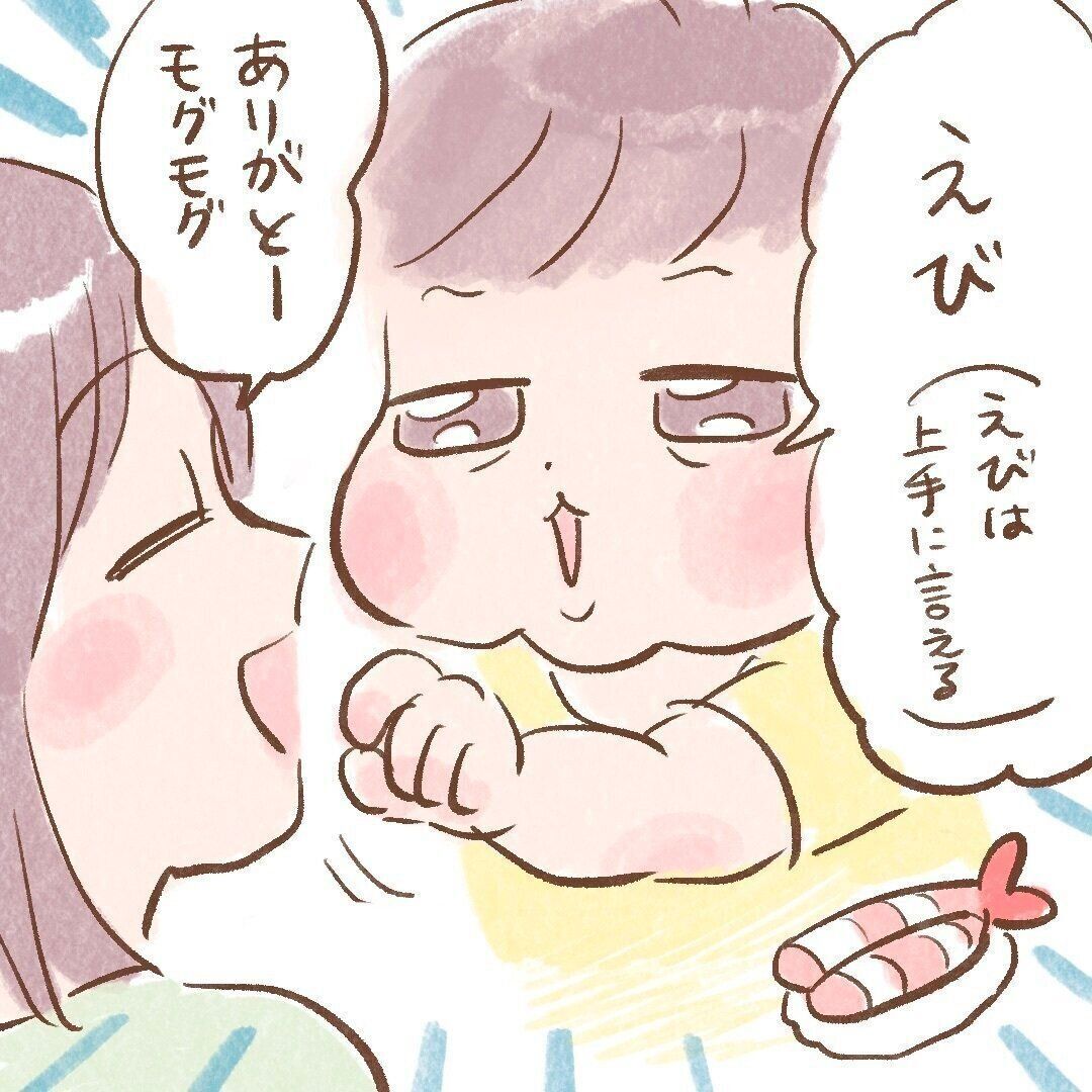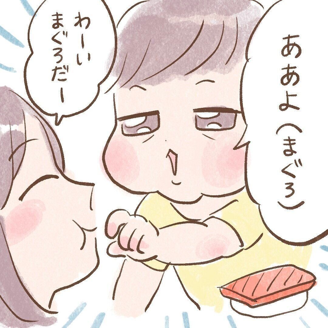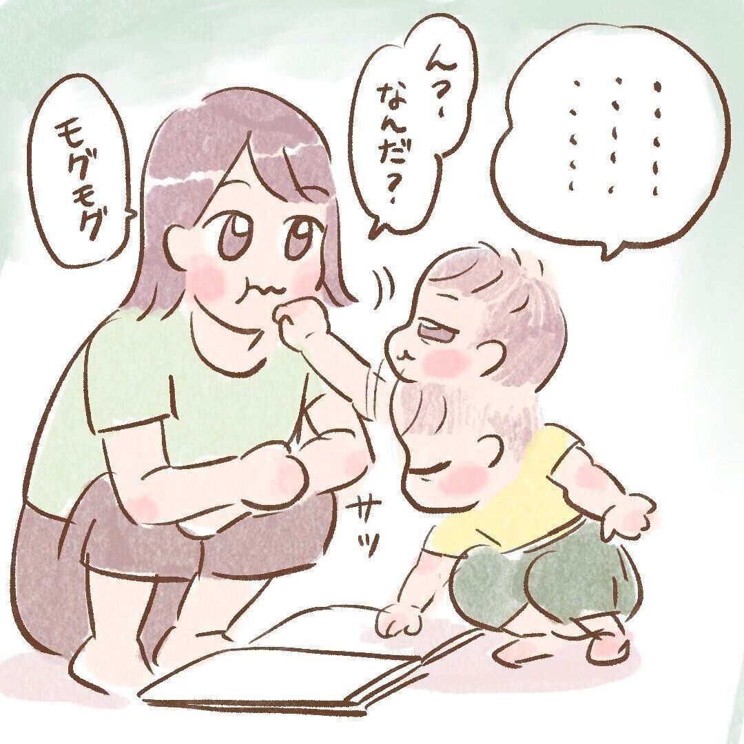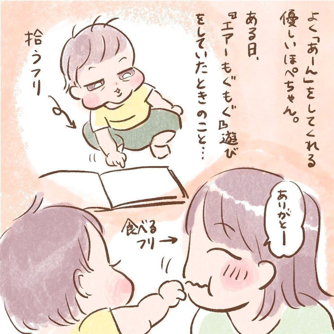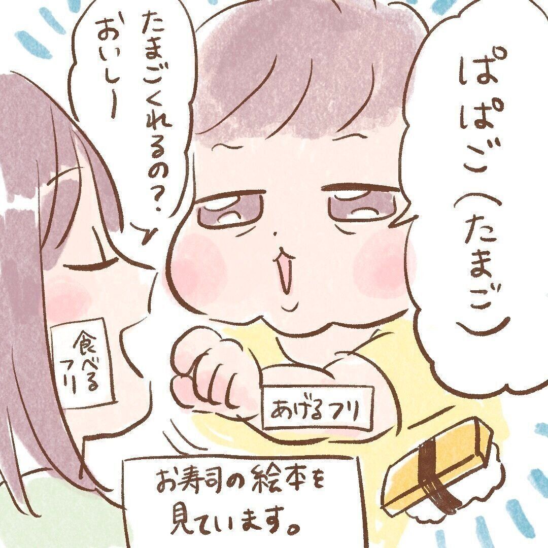 ほぺちゃんがお寿司の絵本から何かを取って「はい、あーん」をしてくれるので、もぐもぐ食べるフリをしていたときのこと。