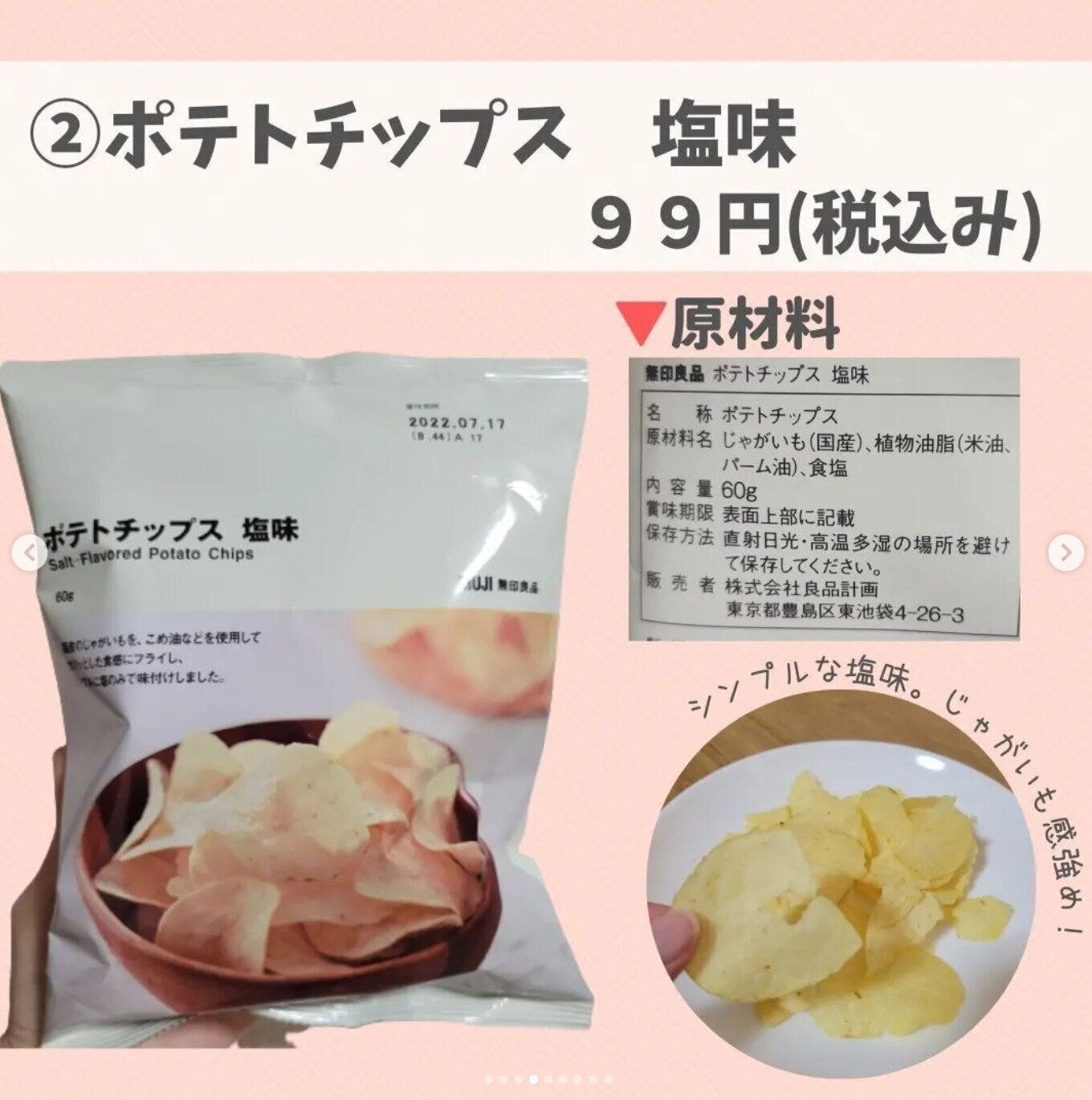 こちらはachiki_mutenkaさんが無印良品で購入した「ポテトチップス 塩味」。原材料はじゃがいもと植物性油脂、食塩だけのようです。じゃがいもが国産なのもうれしいですよね♪ シンプルな塩味で、しっかりじゃがいもを感じられるそうです。