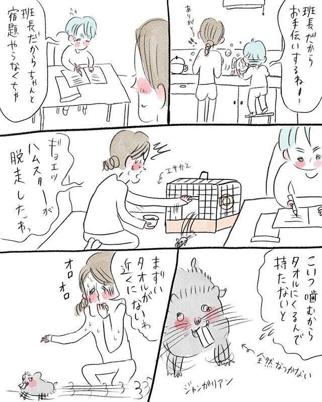<「班長だから…!」と頑張る息子くんをよそに、ハムスターが脱走!>