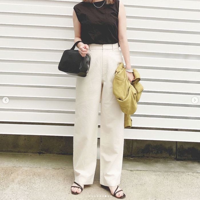 __htm.i_さんは、リブタンクトップとスマートアンクルパンツを購入。ネイビーのリネンジャケットを羽織って、上品な着こなしにしてみたんだそう。タンクトップは生地がしっかりしており、首周りもしっかりと縁取りしてあるので、かがんでも胸元が見えなかったんだとか。夏のマストバイアイテムですね♪