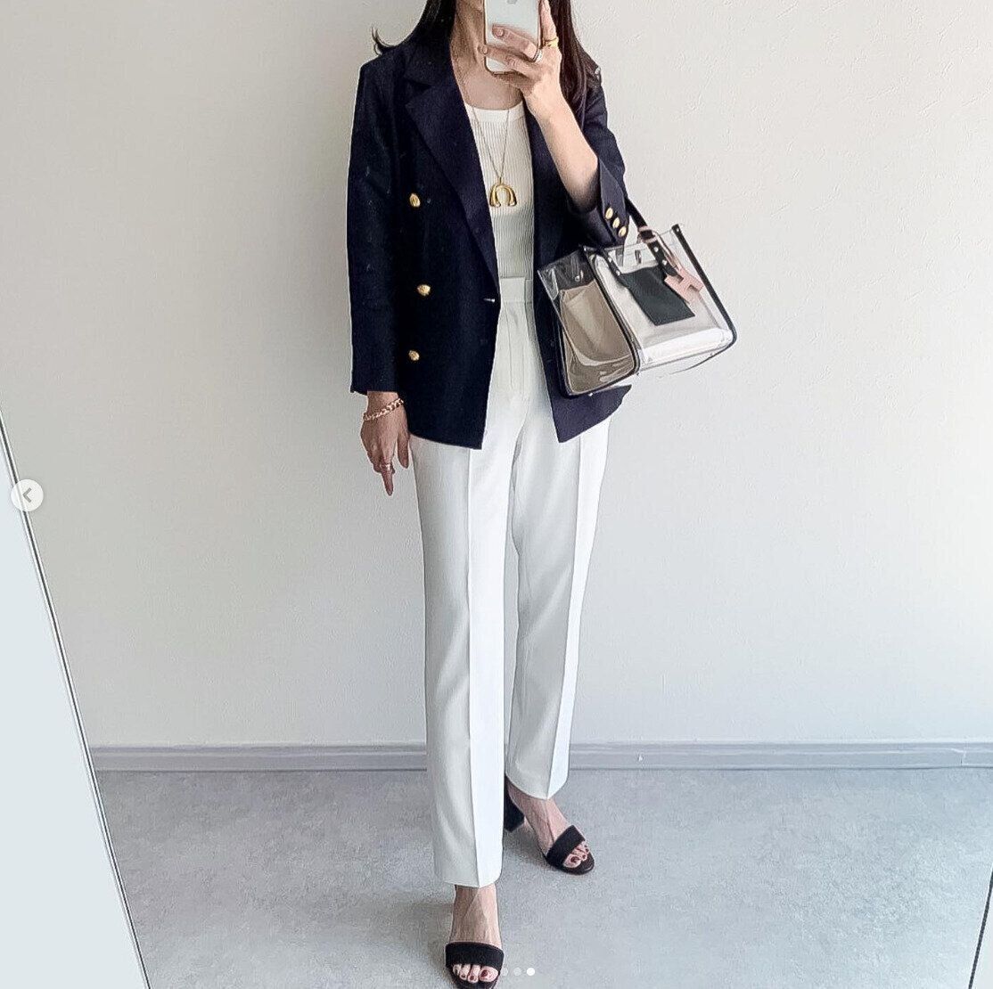 __htm.i_さんは、リブタンクトップとスマートアンクルパンツを購入。ネイビーのリネンジャケットを羽織って、上品な着こなしにしてみたんだそう。タンクトップは生地がしっかりしており、首周りもしっかりと縁取りしてあるので、かがんでも胸元が見えなかったんだとか。夏のマストバイアイテムですね♪