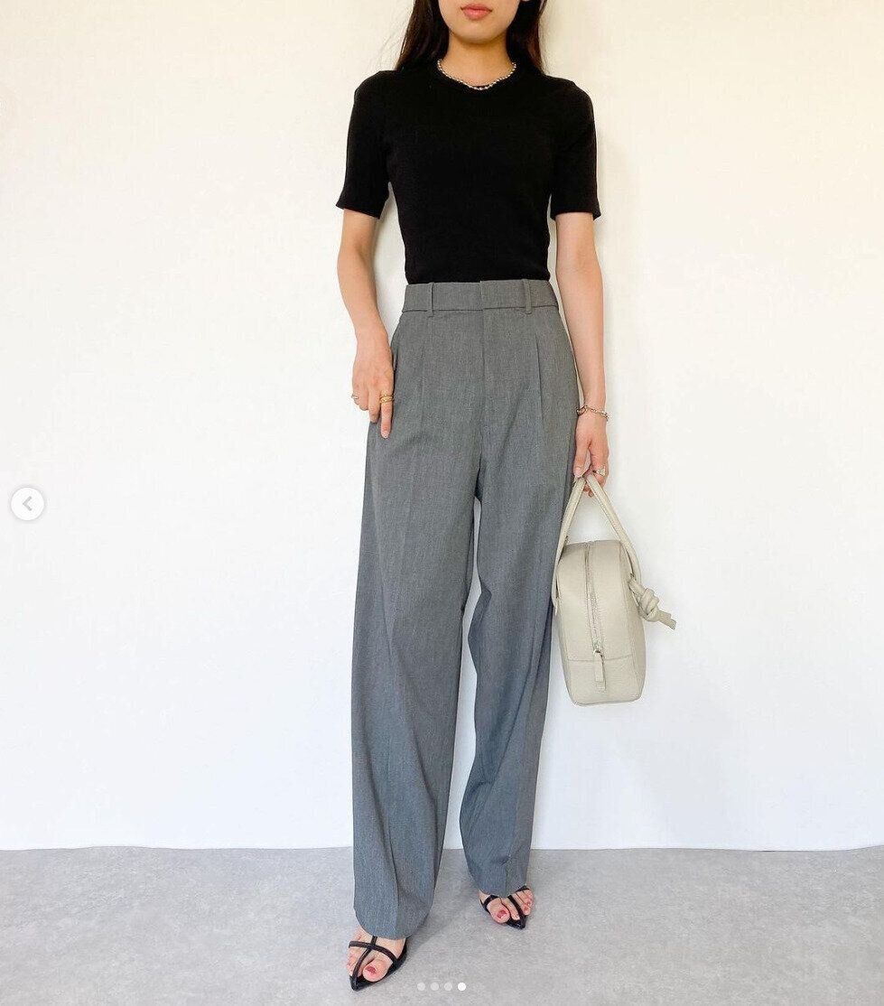 こまきさんは、リブクルーネックTとタックワイドパンツを購入。パンツは「めちゃめちゃ良い!」ととってもお気に入りのようですよ。シルエットがキレイなので、コーデもバッチリ決まりますね。シンプルでかっこいいモノトーンコーデですね。