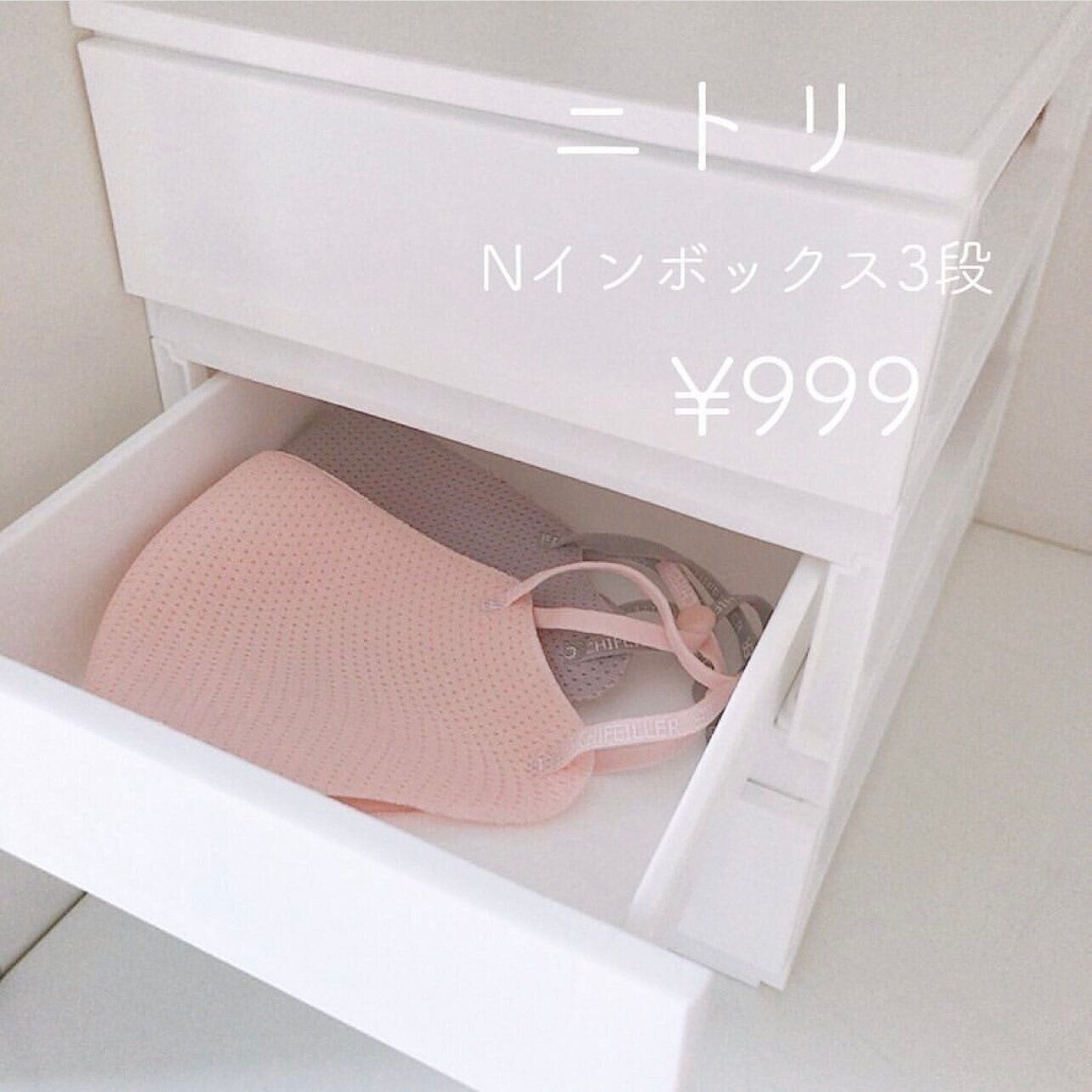 ちかさんが玄関で使用しているのは、ニトリの「引出し Nインボックス たて型ハーフ 3段」です。外出時の必需品であるマスクはここに収納できます。ハンドタオルやポケットティッシュ、アルコールタオルなどをしまうのもよさそうですね。
